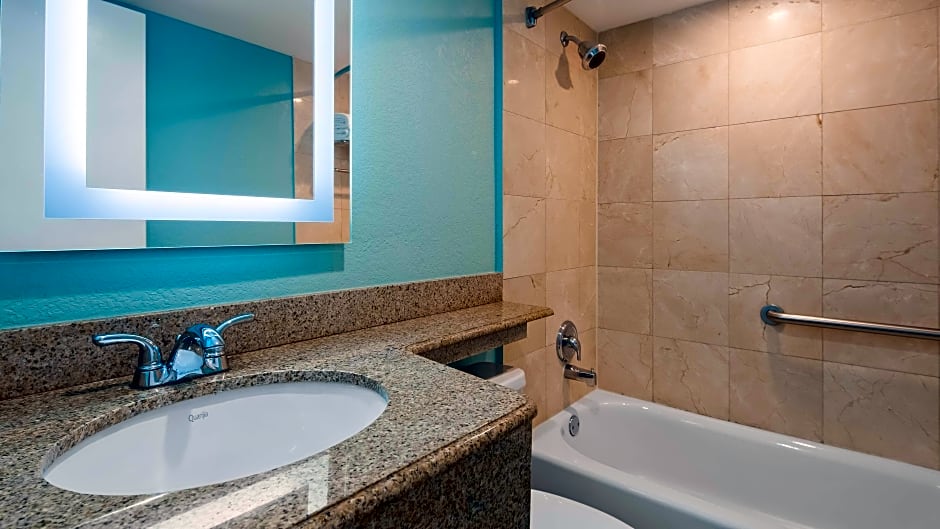 Relax in heightened luxury in our non-smoking king suite, with a poolside location, outdoor entrance, oversized king bedroom, separate bath and whirlpool tub, two 42-inch flat screen TV's, DVD player. Enjoy the additional amenities such as a sofabed, Wi-Fi, refrigerator, microwave, electronic safe, hairdryer, coffee maker and complimentary hot breakfast buffet.